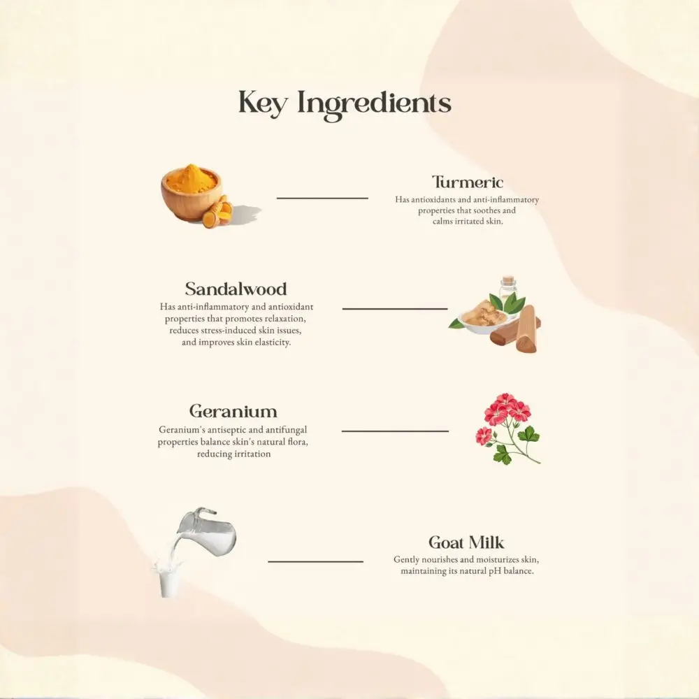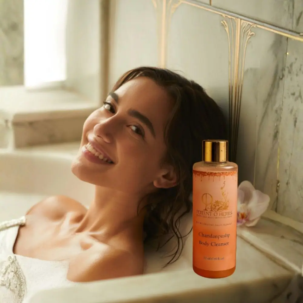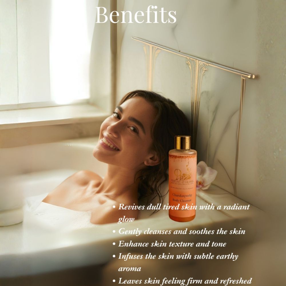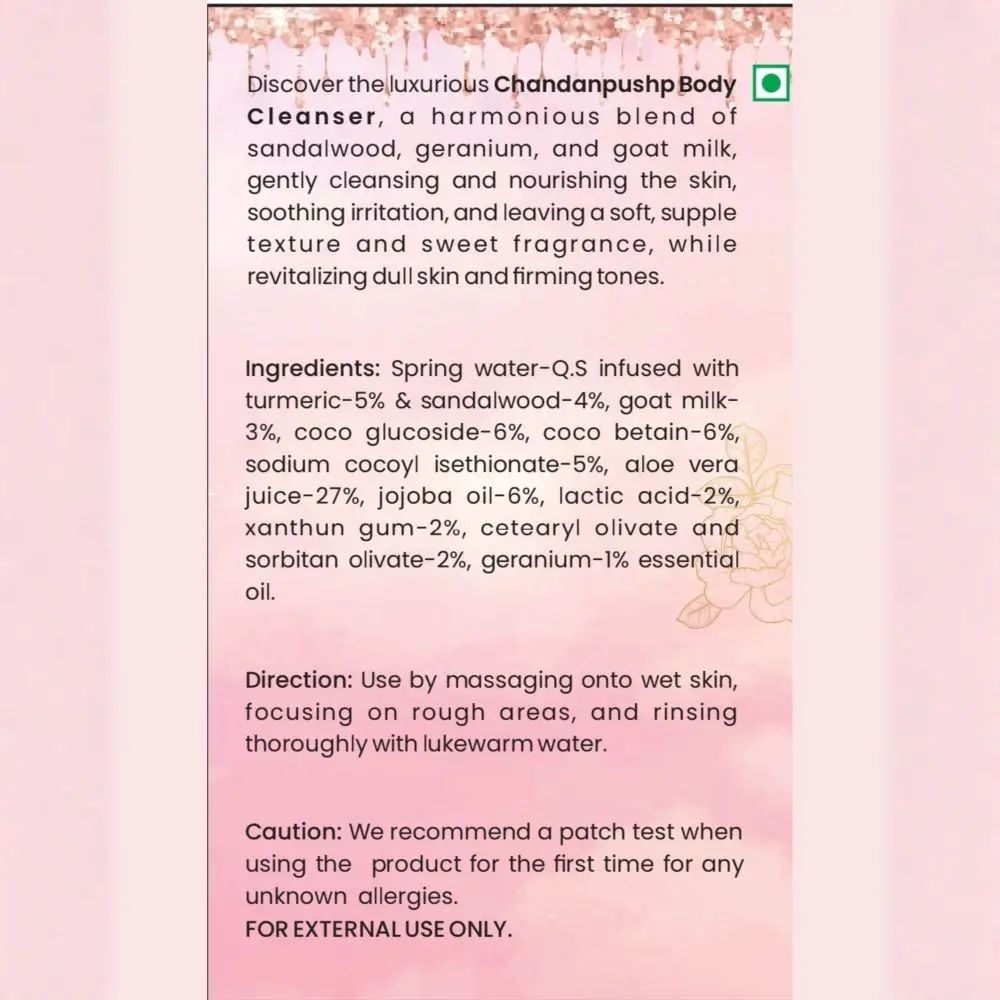 Discover the luxurious Chandanpushp Body Cleanser, a harmonious blend of sandalwood, geranium, and goat milk, gently cleansing and nourishing the skin, soothing irritation, and leaving a soft, supple texture and sweet fragrance, while revitalizing dull skin and firming tones.