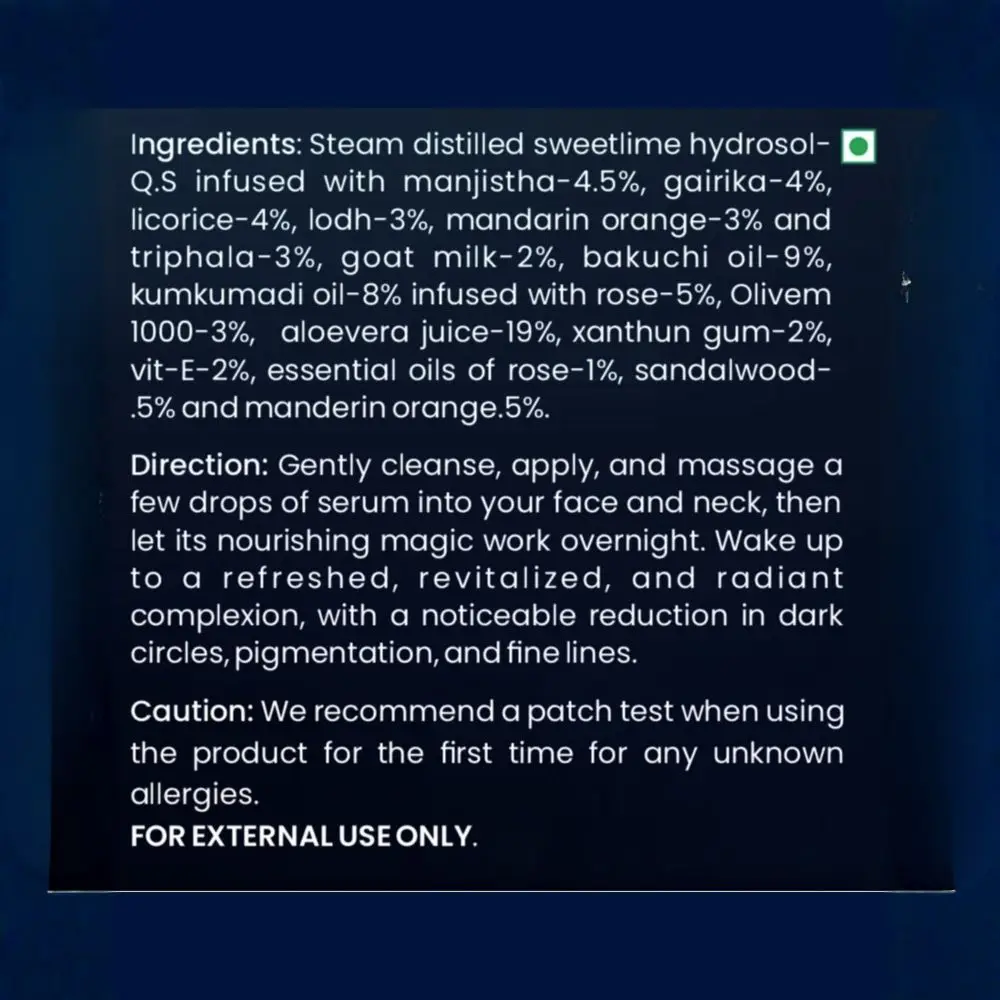 Steam-distilled Sweet Lime Hydrosol (infused with Manjistha, Gairika, Licorice, Lodh, Mandarin Orange, and Triphala Powder), Goat Milk, Bakuchi Oil, Kumkumadi Oil infused with Rose, Aloe Vera Juice, essential oils of Rose, Sandalwood, and Mandarin Orange