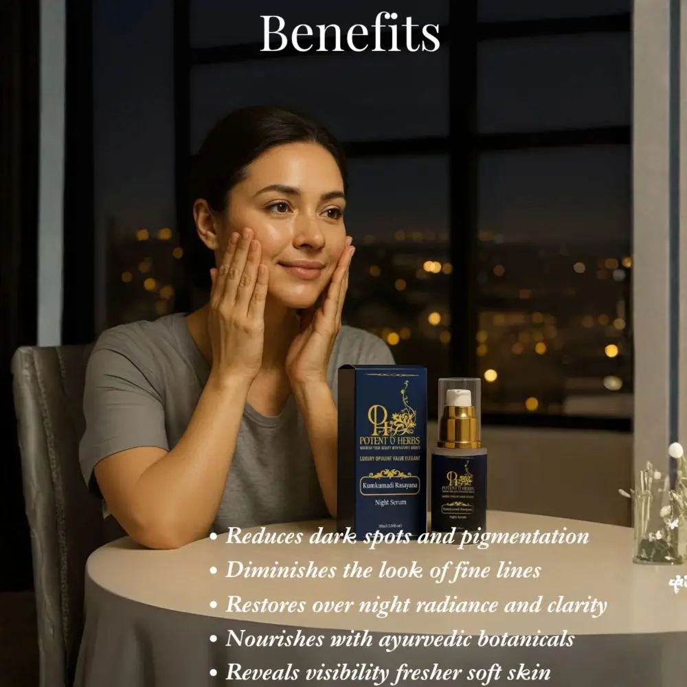 Discover the overnight transformative power of Kumkumadi Rasayana Night Serum, a centuries-old Ayurvedic blend of manjistha, licorice, and kumkumadi oil, infused with rose, that reveals radiant, renewed skin by morning.