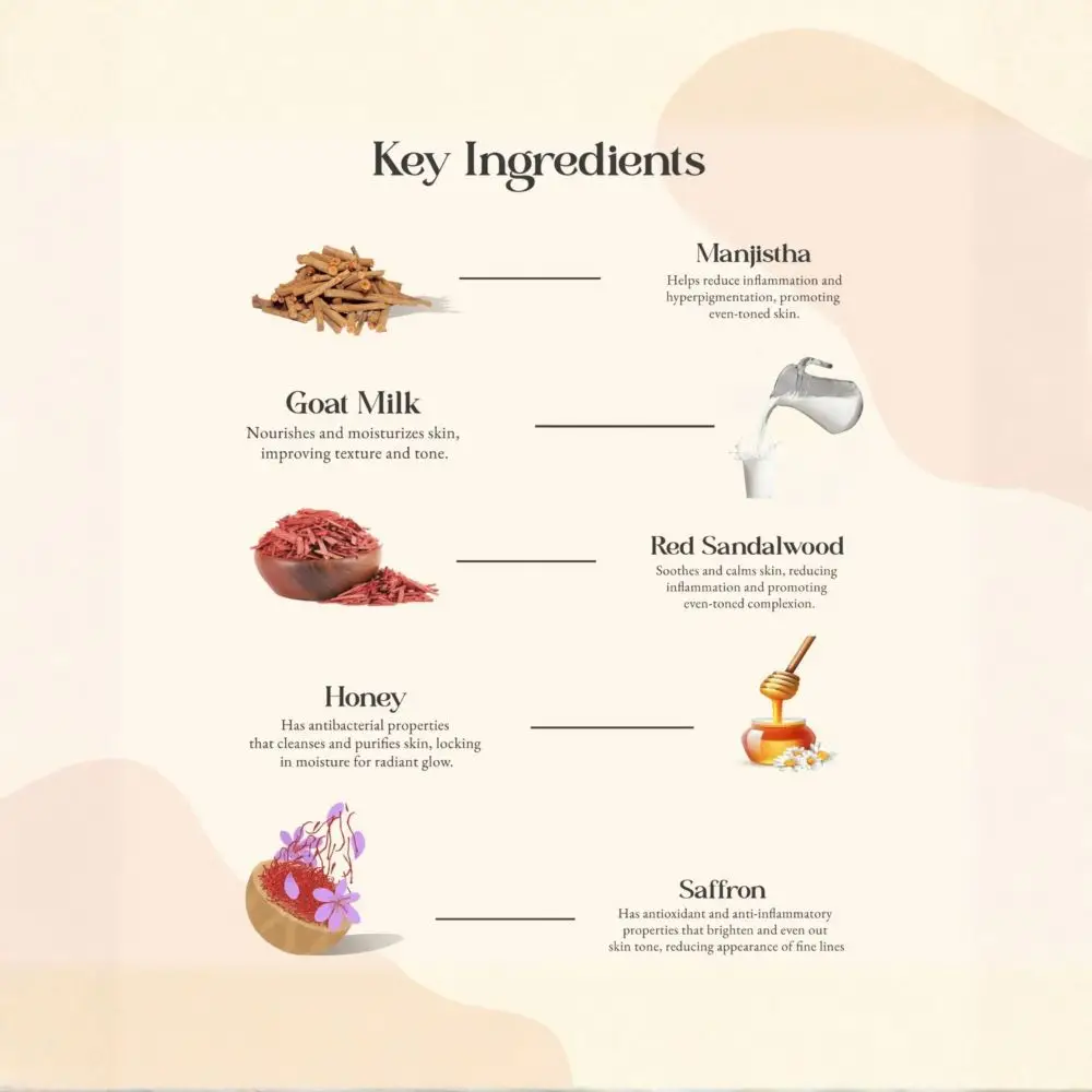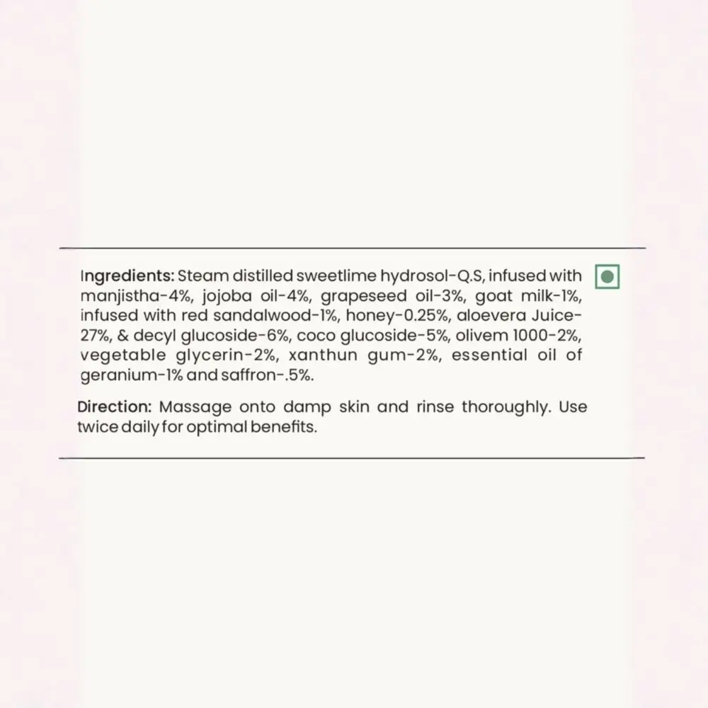 Steam-distilled Sweet Lime Hydrosol infused with Manjistha, Jojoba Oil, Grapeseed Oil, Goat Milk infused with Red Sandalwood, Honey, Aloe Vera Juice, Vegetable Glycerin, and essential oils of Geranium and Saffron.