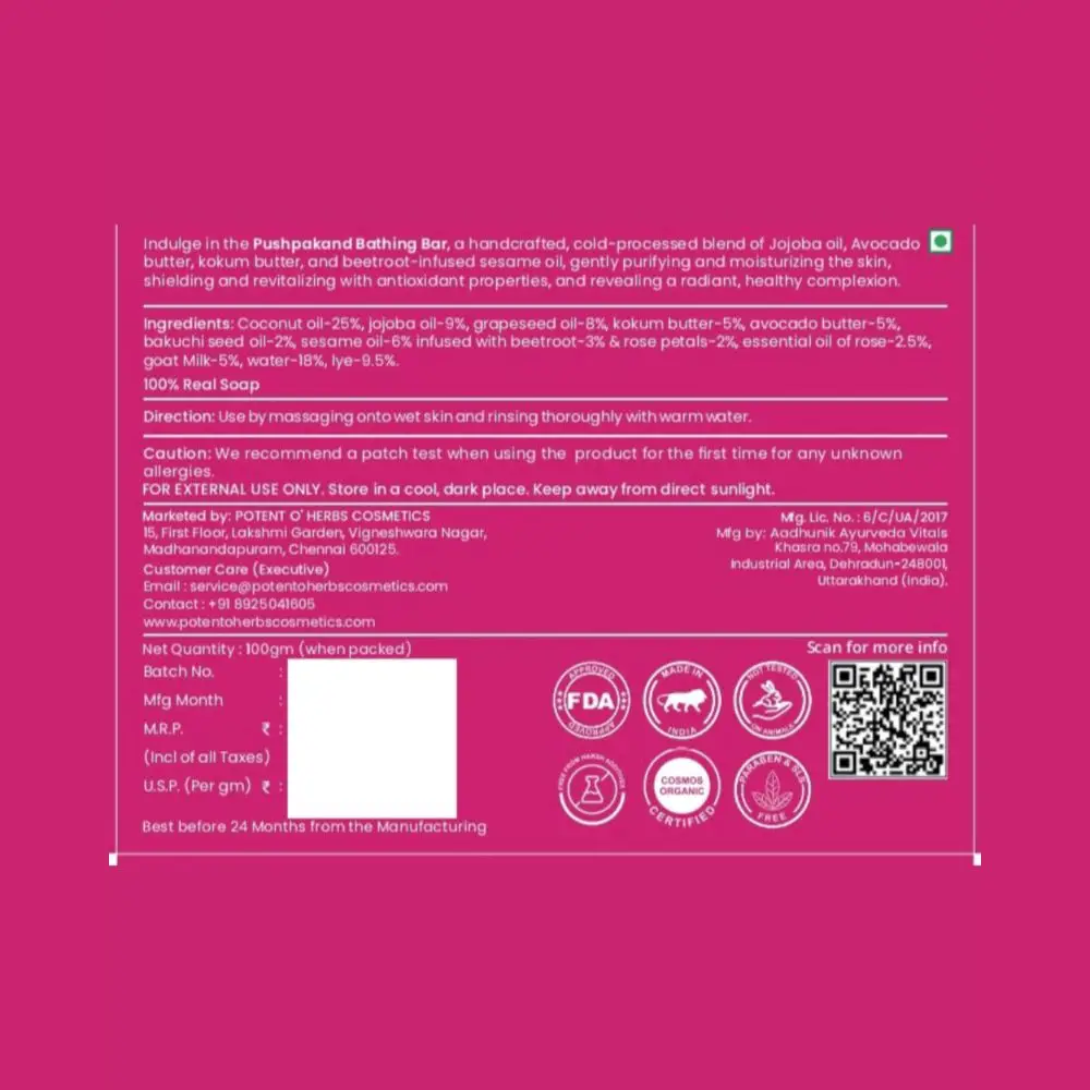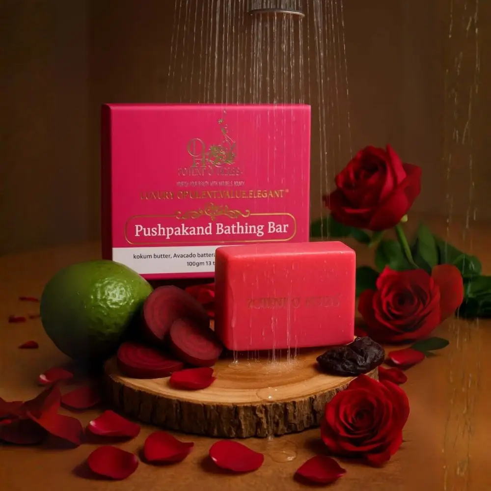 Indulge in the botanical bliss of Pushpakand Bathing Bar, expertly crafted with the vibrant essence of beetroot and the soft, velvety petals of rose. This luxurious cold-processed bar gently purifies and moisturizes, enveloping the skin in a cocoon of hydration and comfort, while its antioxidant properties help to shield and revitalize the skin, revealing a radiant, healthy complexion.