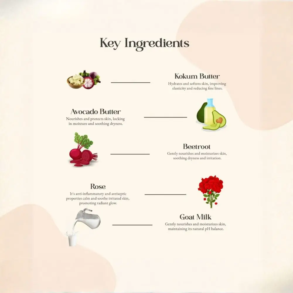 Coconut Oil, Jojoba Oil, Grapeseed Oil, Kokum Butter, Avocado Butter, Bakuchi Seed Oil, Sesame Oil infused with Beetroot and Rose Petals, Rose Essential Oil, and Goat Milk.