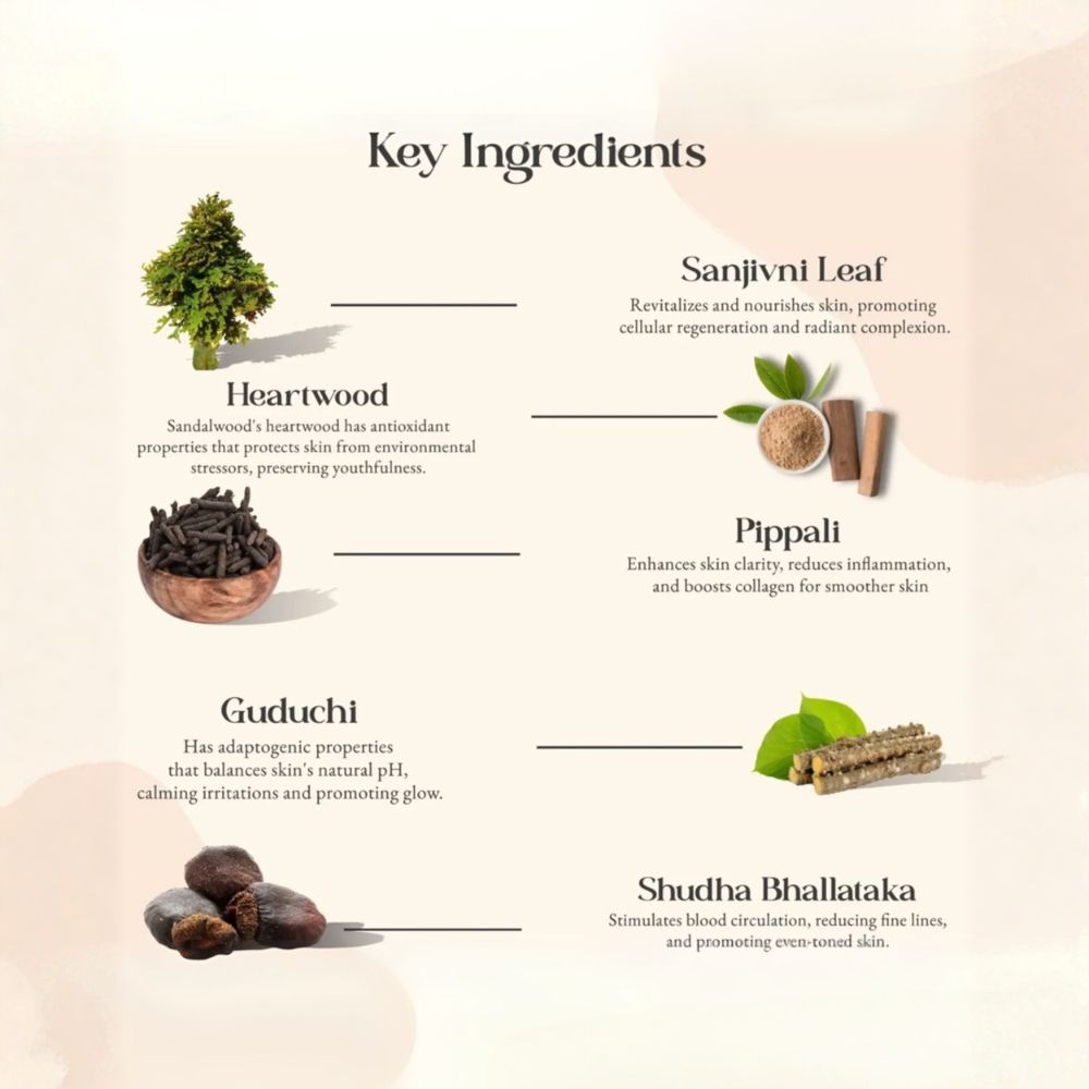 ![]() Heartwood Sandalwood's heartwood has antioxidant properties that protects skin from environmental stressors, preserving youthfulness. |
