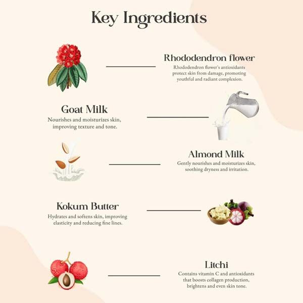 Spring Water infused with Rhododendron flower, Goat Milk, Almond Milk, Kokum Butter, Aloe Vera Juice, Jojoba Oil, and essential oils of Litchi and Vanilla.