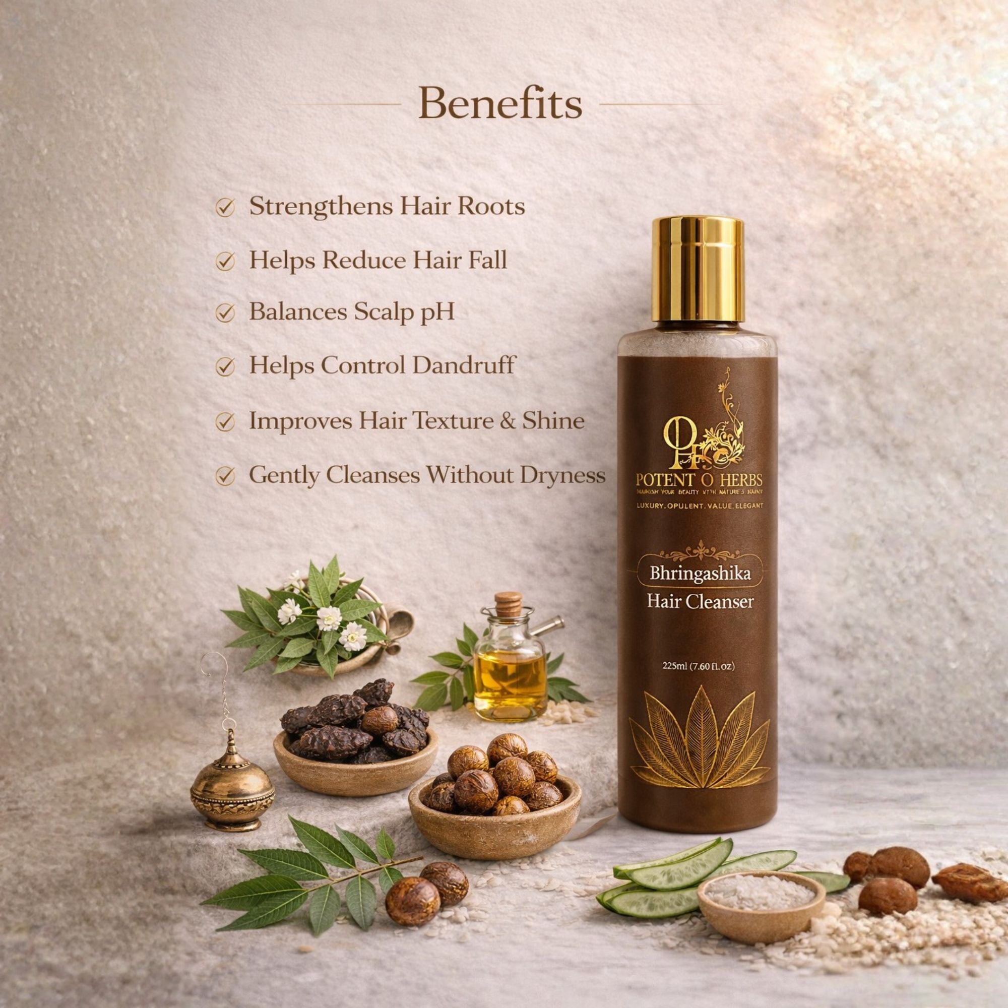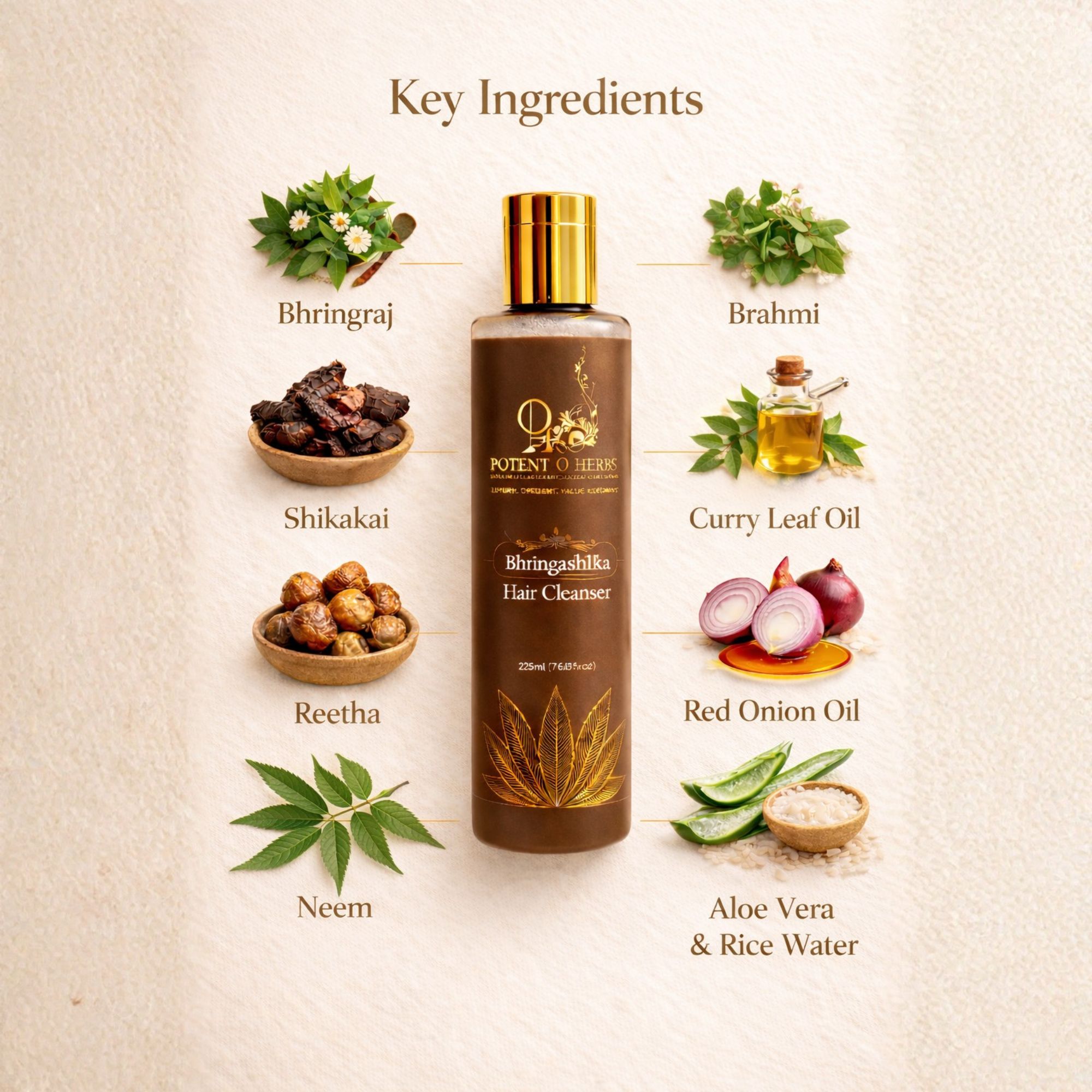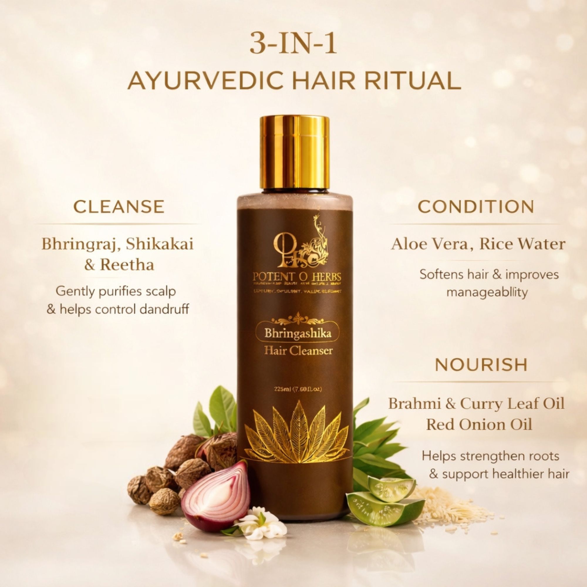 A strengthening Ayurvedic hair-cleansing blend steeped in Bhringraj, Shikakai, and Reetha — for hair that feels bouncier, fuller, and naturally vibrant.
