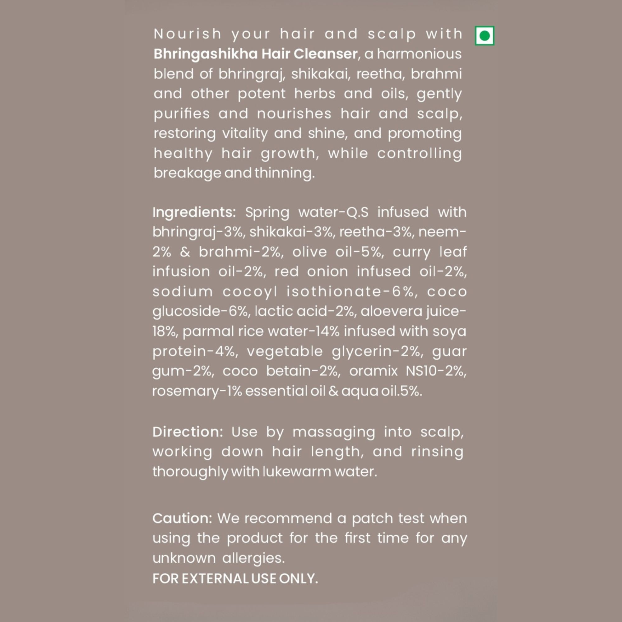 Inspired by the sacred Ayurvedic hair-nourishing rituals, Bhringashikha Hair Cleanser gently purifies the scalp with plant-derived saponins while feeding the follicles with rejuvenating herbs. Curry leaf and red onion infusion oils help support healthy growth, while aloe vera and rice water smoothen strands and enhance natural shine. With every cleanse, hair feels stronger, lighter, and visibly renewed — a return to lush, healthy beauty.