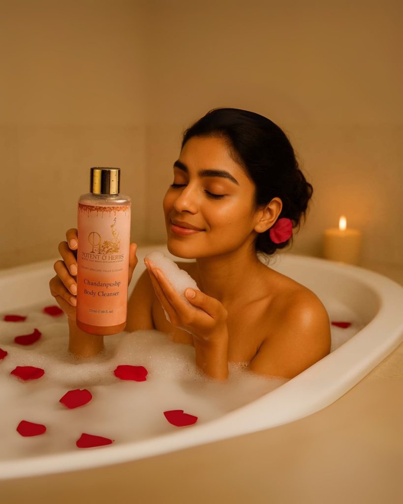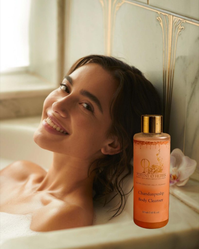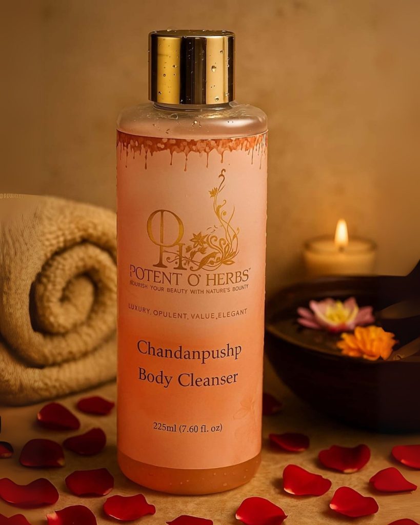 Discover the luxurious Chandanpushp Body Cleanser, a harmonious blend of sandalwood, geranium, and goat milk, gently cleansing and nourishing the skin, soothing irritation, and leaving a soft, supple texture and sweet fragrance, while revitalizing dull skin and firming tones.
