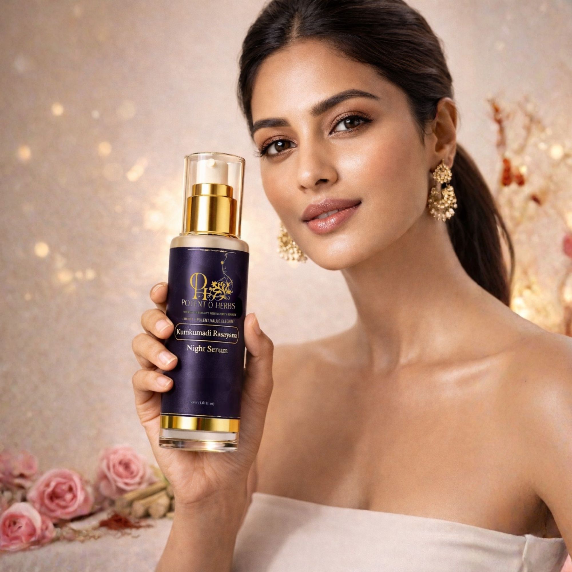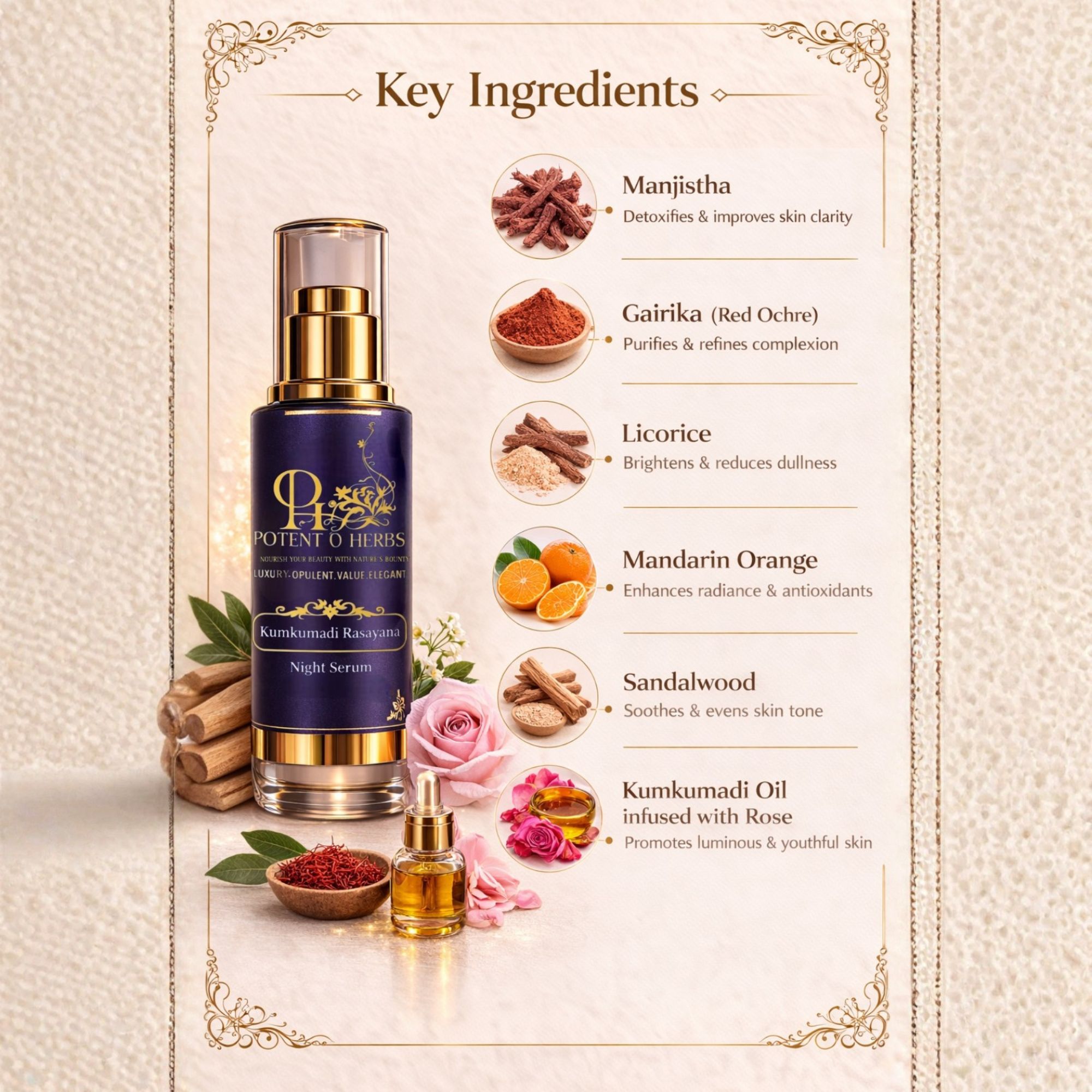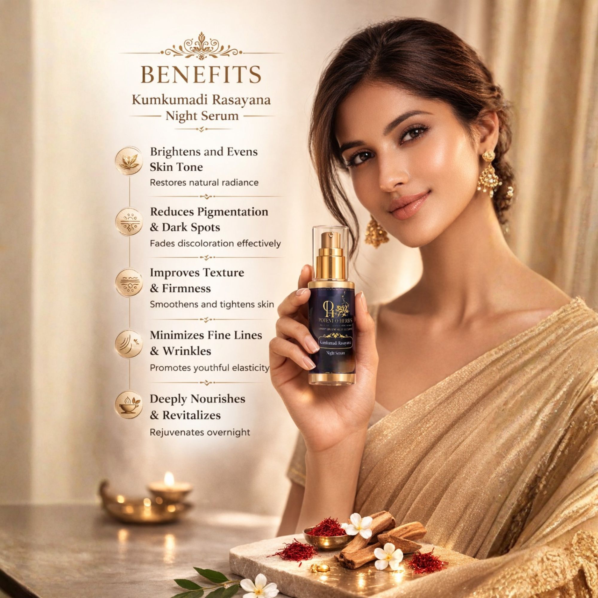 A timeless Ayurvedic overnight beauty elixir enriched with Kumkumadi oil and Manjistha — working through the night to visibly brighten skin, soften fine lines, and reveal a renewed radiance by dawn.