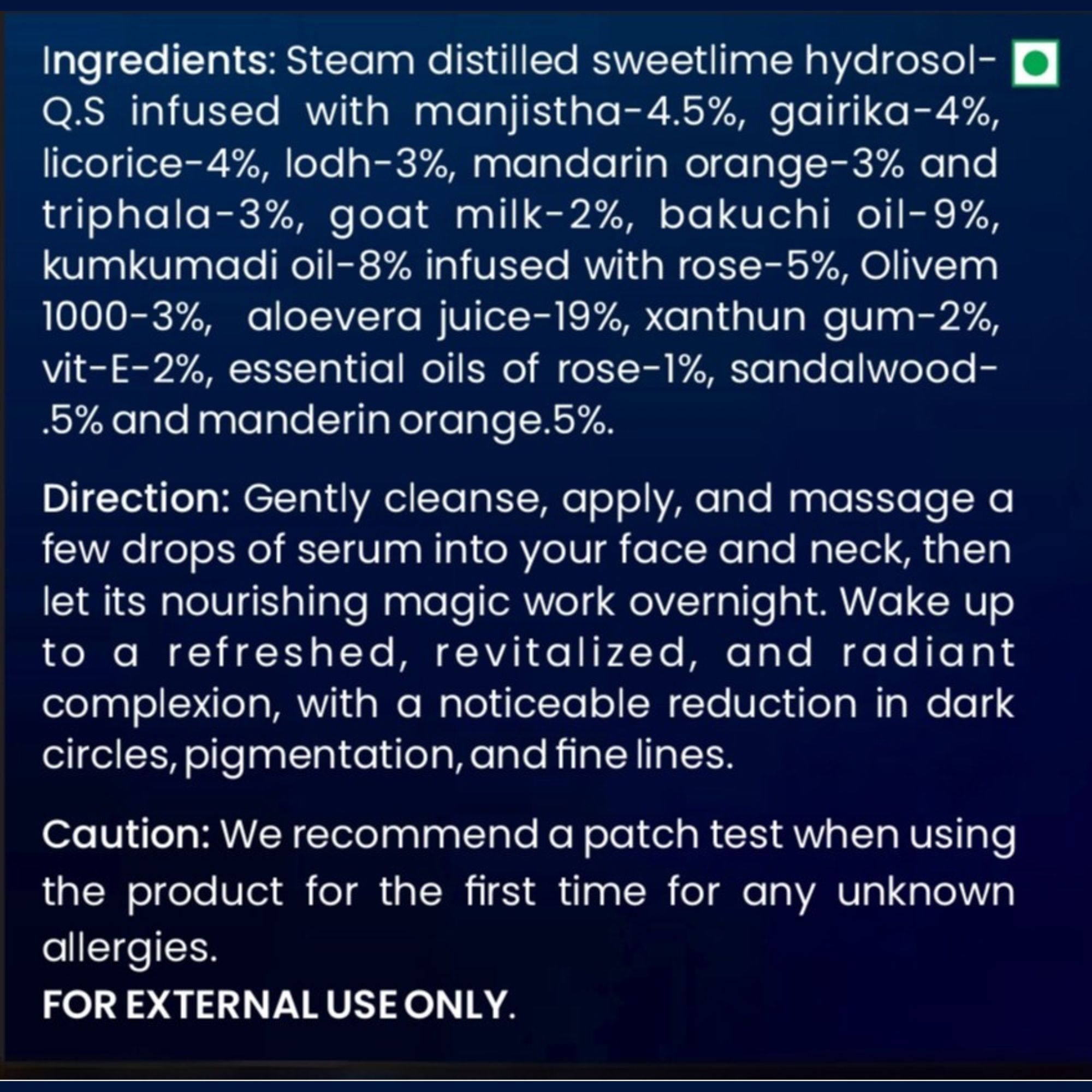 Triphala Powder), Goat Milk, Bakuchi Oil, Kumkumadi Oil infused with Rose, Aloe Vera Juice, essential oils of Rose, Sandalwood, and Mandarin Orange.