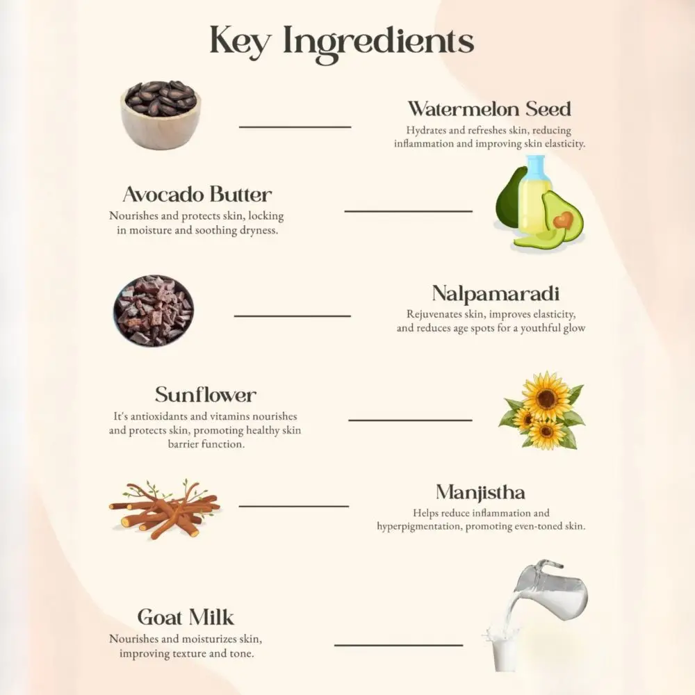 Coconut Oil, Jojoba Oil, Watermelon Seed Oil, Sesame Oil, Nalpamaradi Oil, Sunflower Oil infused with Manjistha, Shea Butter, Olive Oil, Castor Oil, Avocado Butter, Goat Milk, Gangajal, and essential oils of Lily and Lotus.